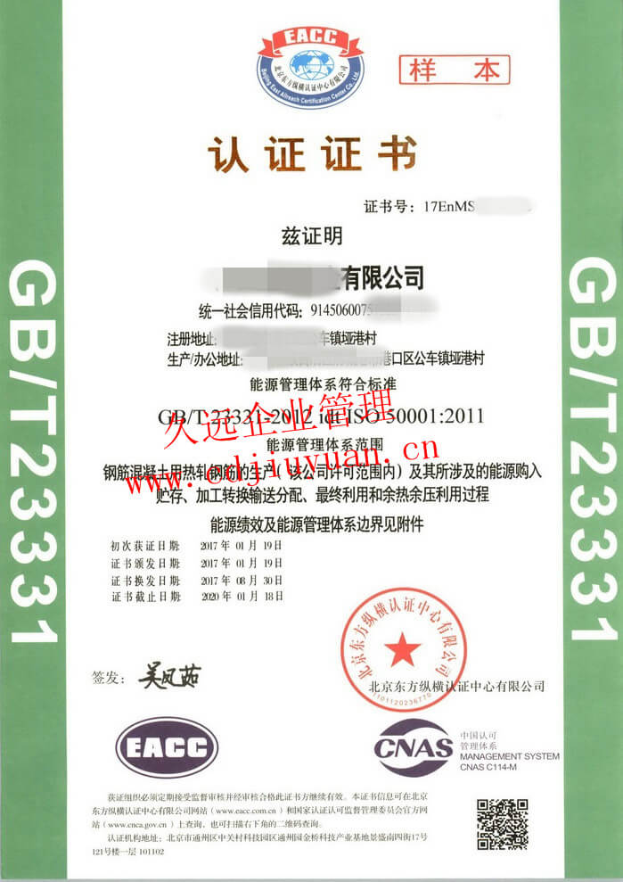 ISO50001能源管理體系認證證書